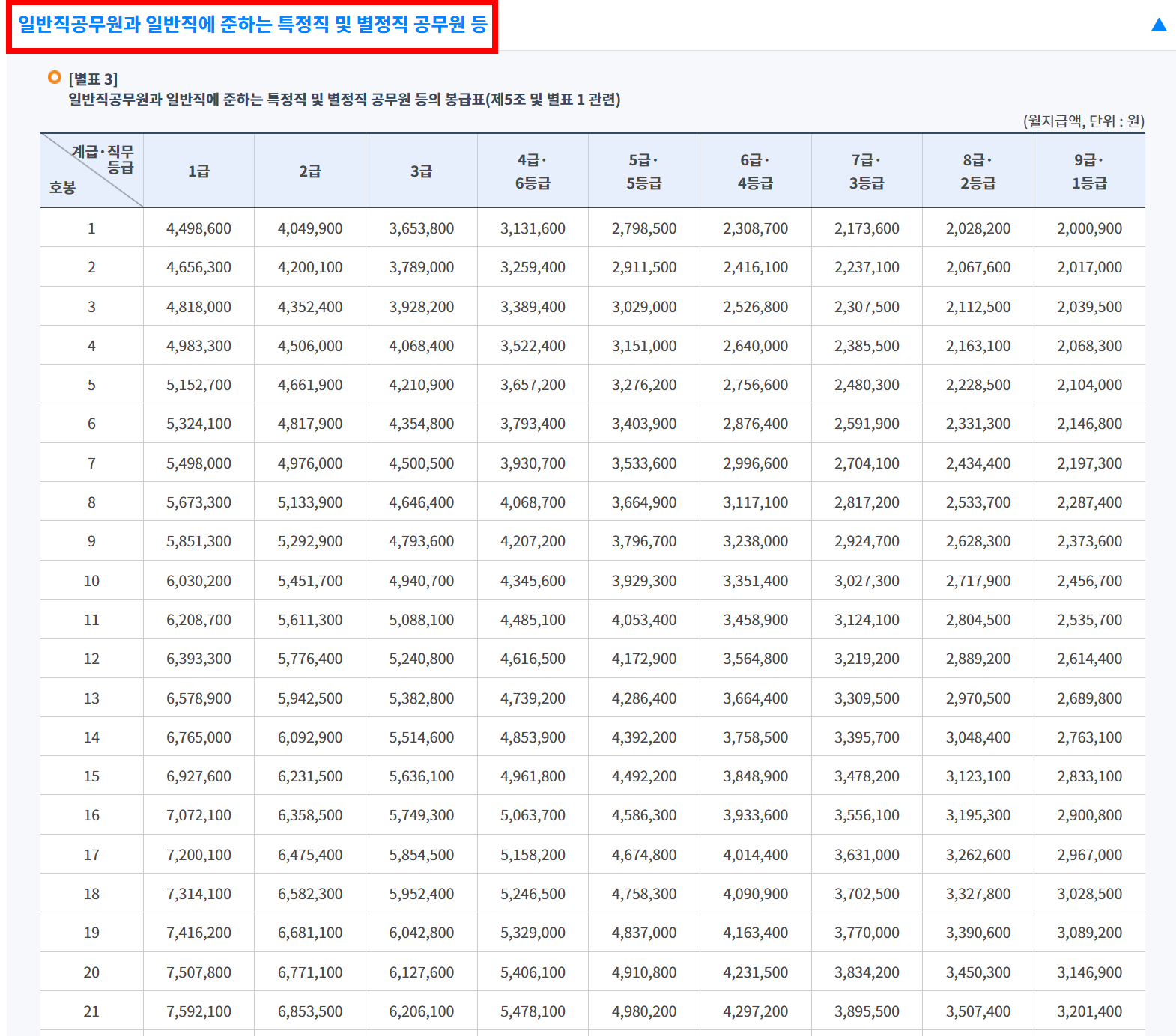 인사혁신처 홈페이지에서 '공무원 인사제도'로 들어가면 직종별 및 직급별 공무원 봉급표를 아래와 같이 확인하실 수 있습니다. 아래 표는 일반직 공무원 봉급표입니다.